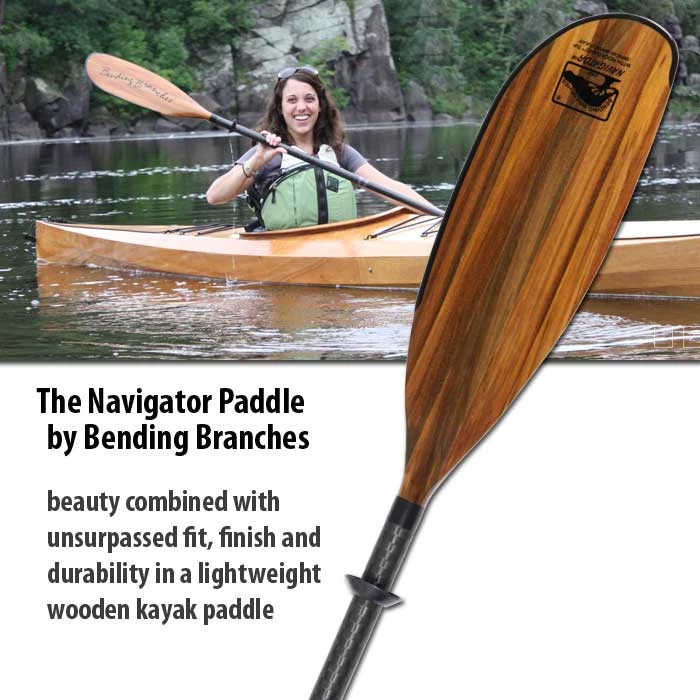The Bending Branches Navigator Plus Hybrid Wood 2-Piece Kayak Paddle combines a carbon shaft with hand-crafted hardwood blades wrapped in fiberglass and protected with Rockgard edges. It is the ultimate combination of technology and handcrafted beauty blending old school with high-tech.