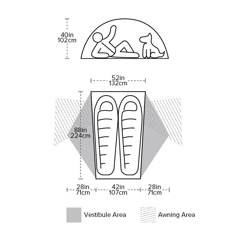 - Vestibule awnings can be set up with trekking poles or using the included extra guylines