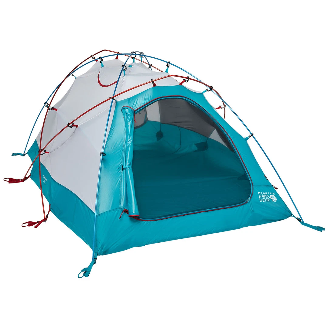 The Mountain Hardwear Trango 2-Person Camping Tent has become a standard issue for mountaineering expeditions year-round. Featuring D-shaped front and rear doors that conveniently tuck away, welded loops for securing the fly, and a bathtub-style floor for better weather protection.