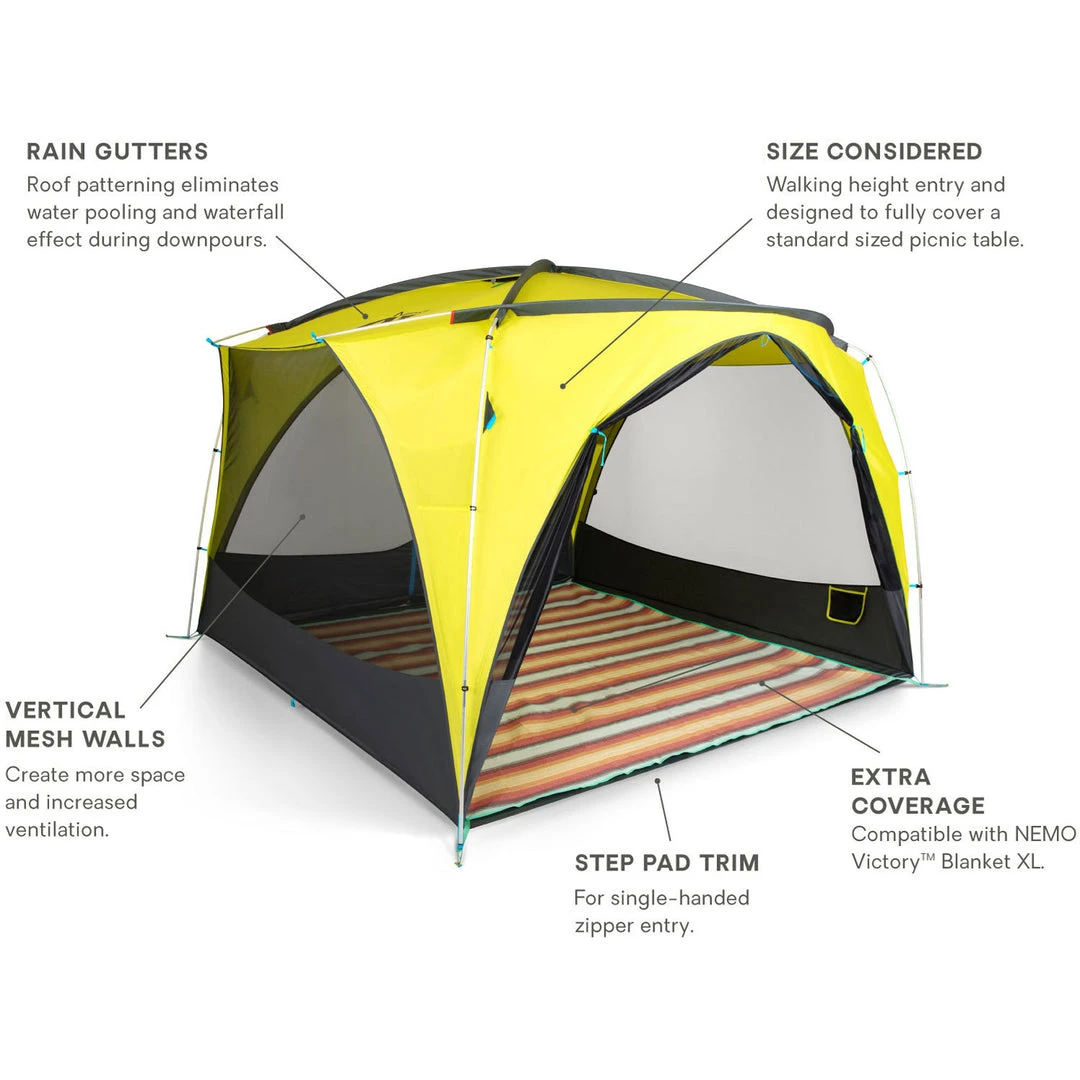 The Nemo Victory Screenhouse is NEMO’s cavernous and convenient freestanding shelter designed for every group gathering, from car camping to backyard BBQs. With rain gutters to outsmart pooling water on the roof, to a step-pad that enables one-handed entry.