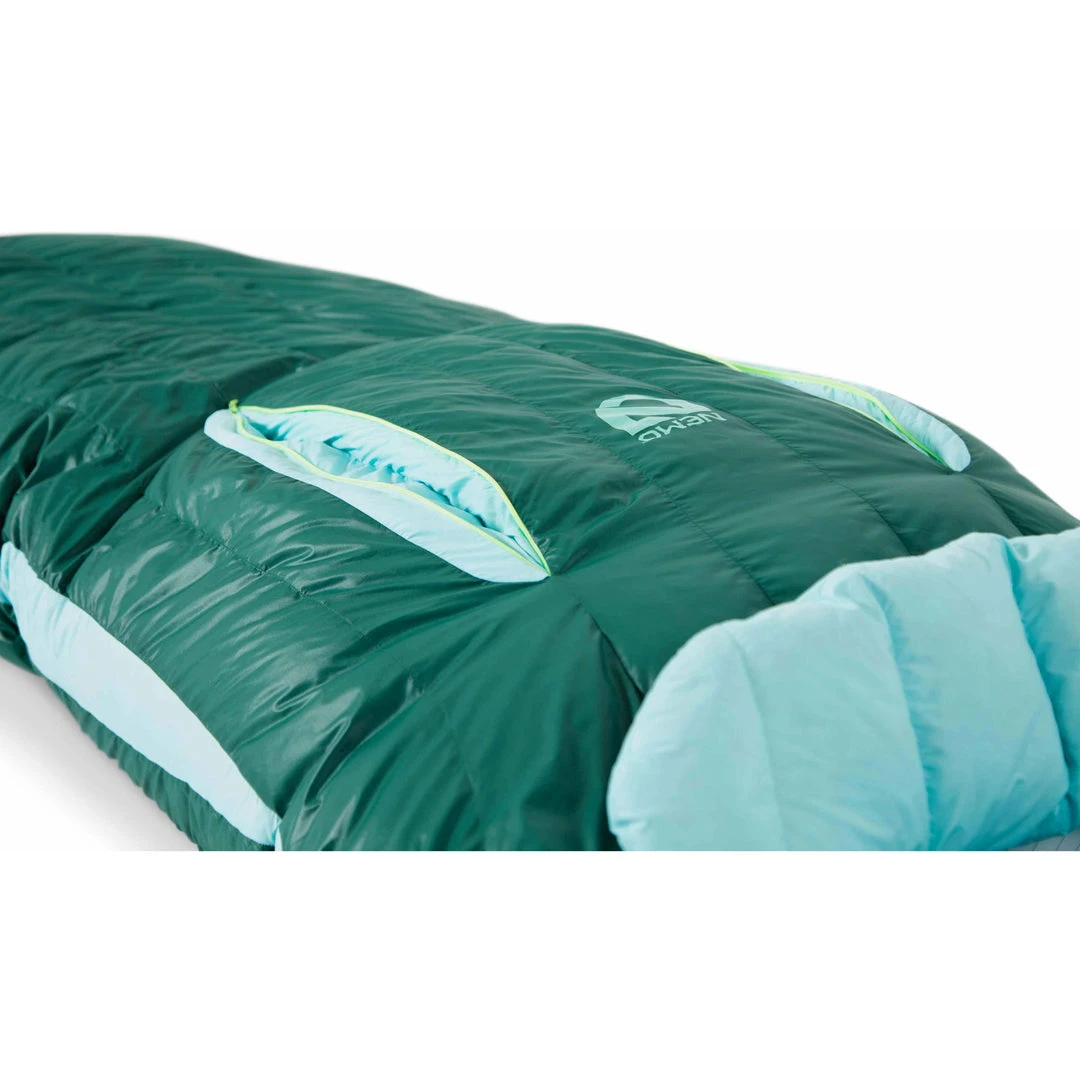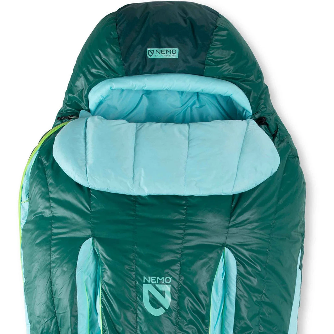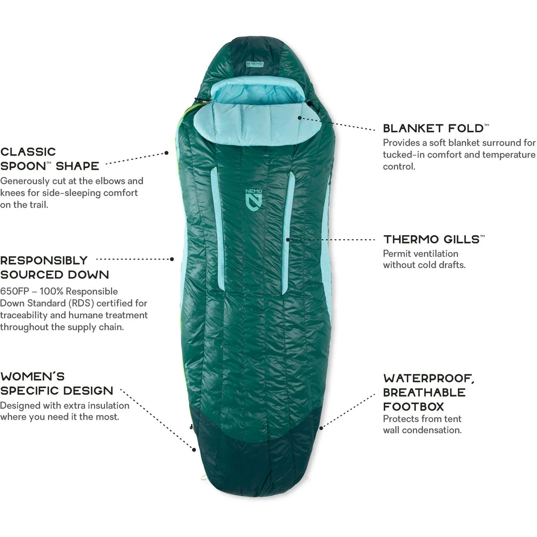 With a unique Spoon shape adding room at the elbows and knees, the Nemo Women’s Disco 30-Degree Down Sleeping Bag is a three-season down women’s backpacking bag that is designed for side sleepers, and allows you to shift positions throughout the night.