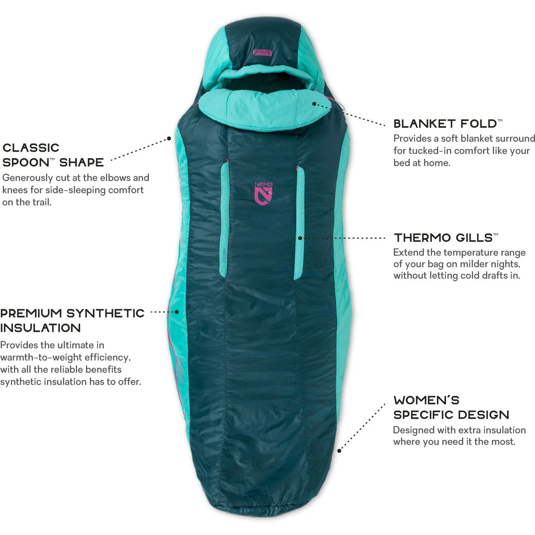 The Nemo Women’s Forte 35-Degree Synthetic Sleeping Bag has Primaloft’s, lightweight, ultra-lofty & supremely resilient RISE insulation. Forte’s classic Spoon shape provides a generous cut at the elbows & knees so side sleepers can shift positions comfortably throughout the night.