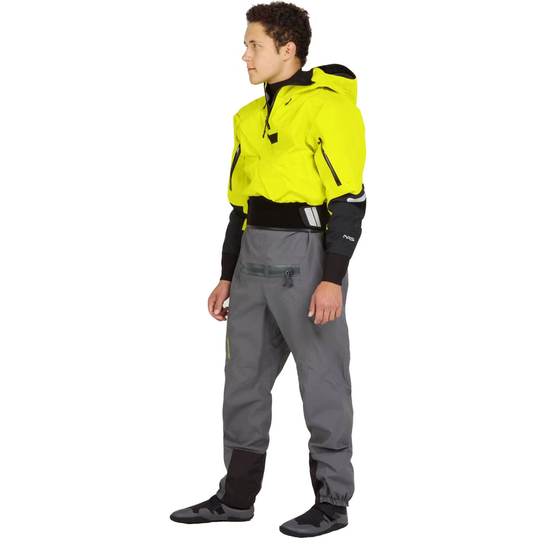 Versatile, breathable, and waterproof, the NRS Men’s Navigator GORE-TEX Pro Semi-Dry Suit is suitable for paddling, kayaking, and water sporting adventures in unpredictable conditions. The adjustable storm hood and face shield with small holes protect the face and offer all-day comfort.