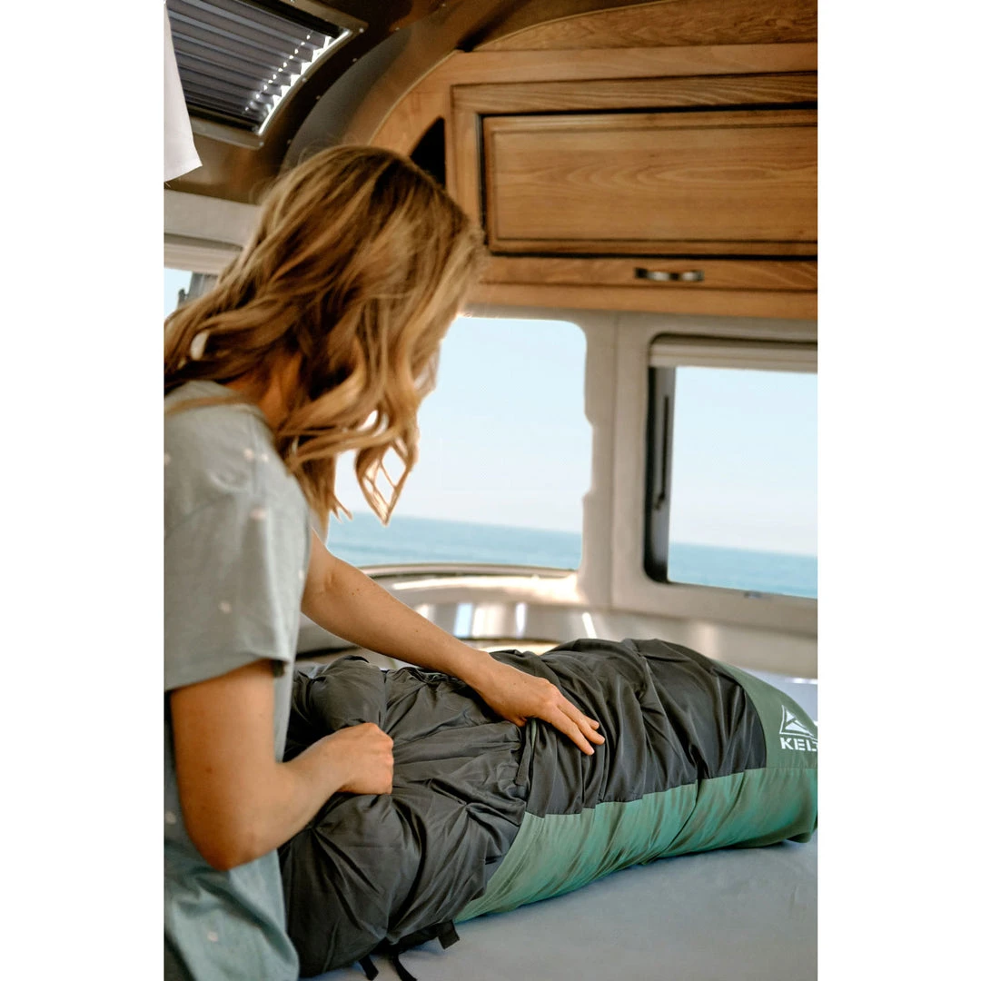 The Kelty Kush 30 Degree Synthetic Sleeping Bag is stylish, cozy, compressible, and warm and serves multiple uses as a sleeping bag, comforter, or pillow. The 3-in-1 Kush is ideal for outdoor camping, indoor camping, and is also useful while traveling in the car.
