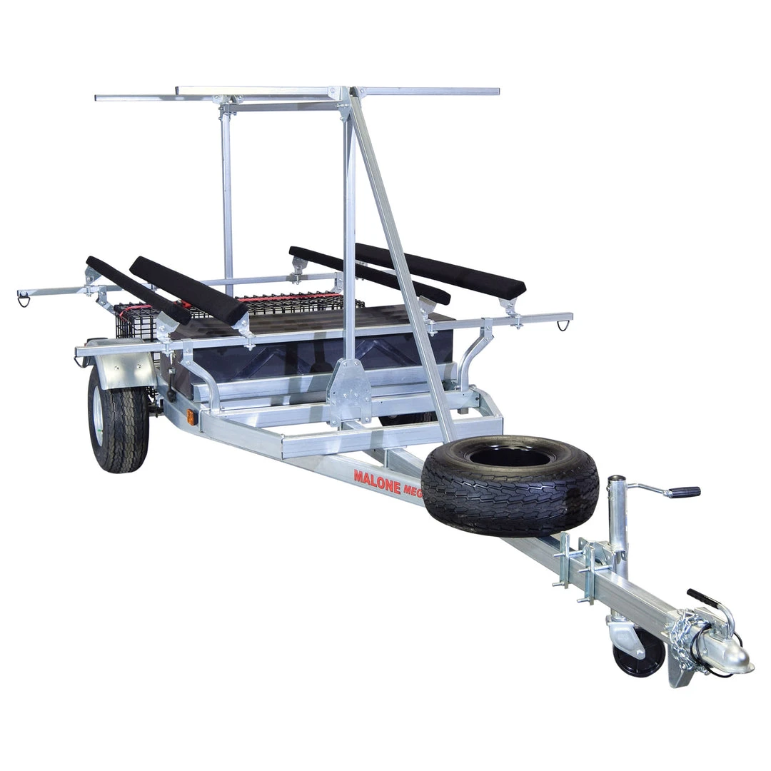 The Malone Megasport 2-Boat Bunks Trailer Package w/ 2nd Tier include Bunk Kits which offer a versatile platform to transport a wider array of watercraft. This marine-grade steel frame trailer is bundled with a spare tire kit, 2nd tier load bars, a sliding storage drawer and a wet gear basket.