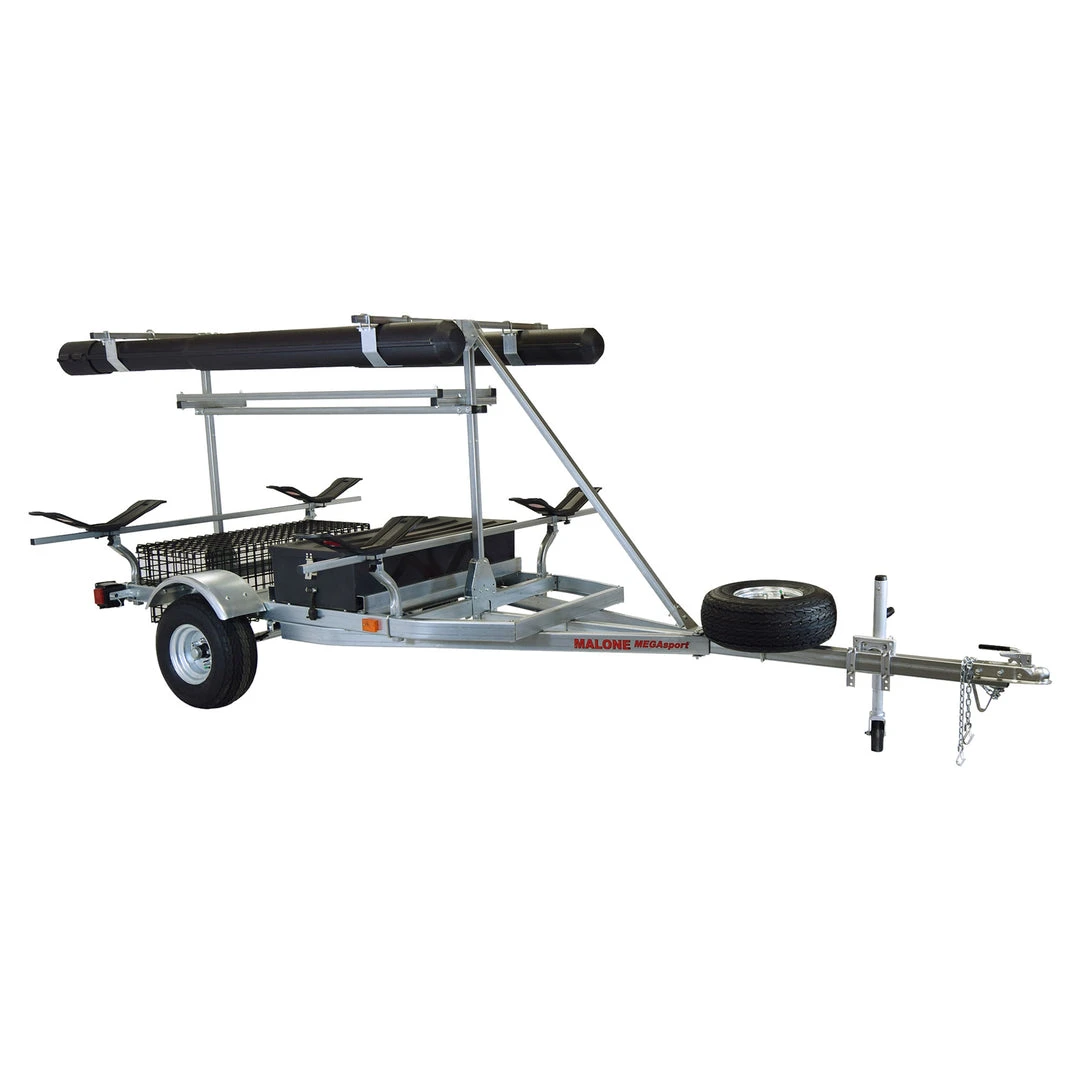 The Malone MegaSport MegaWing Ultimate Trailer Package lets you carry the biggest boats and all your gear. This marine-grade trailer is bundled with MegaWing cradles, sliding storage drawer, 2nd tier load bars, wet gear basket, two sets of rod storage tubes, a milk crate cage, and a spare tire kit.