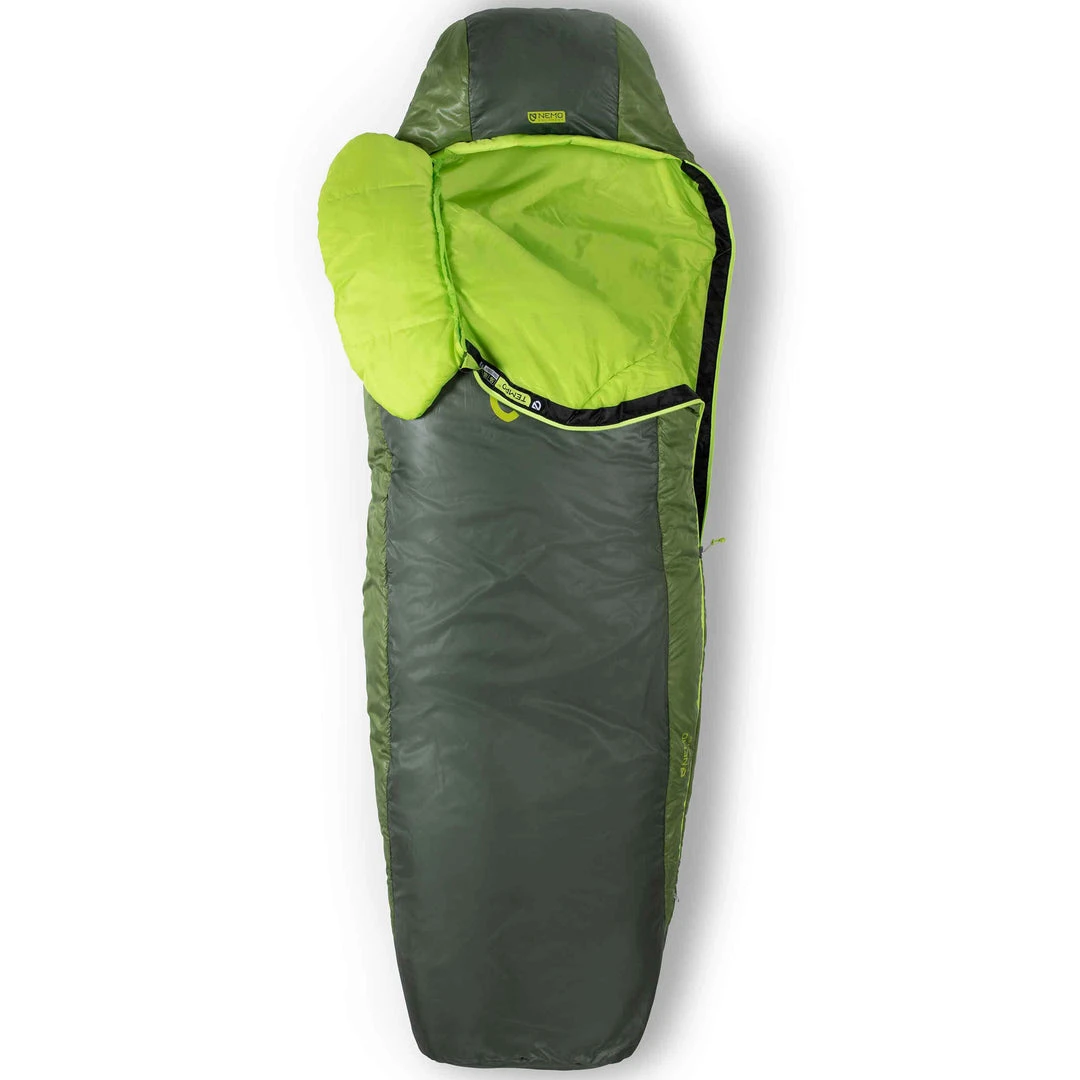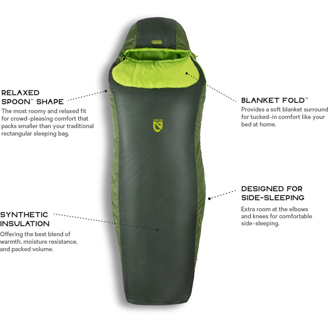 The Nemo Men’s Tempo 35-Degree Synthetic Sleeping Bag blends roomy comfort with Nemo’s popular Spoon shape for a relaxed, crowd-pleasing fit that packs smaller than a rectangular sleeping bag. Tempo offers the best blend of moisture resistance, comfort, packability, and affordability.