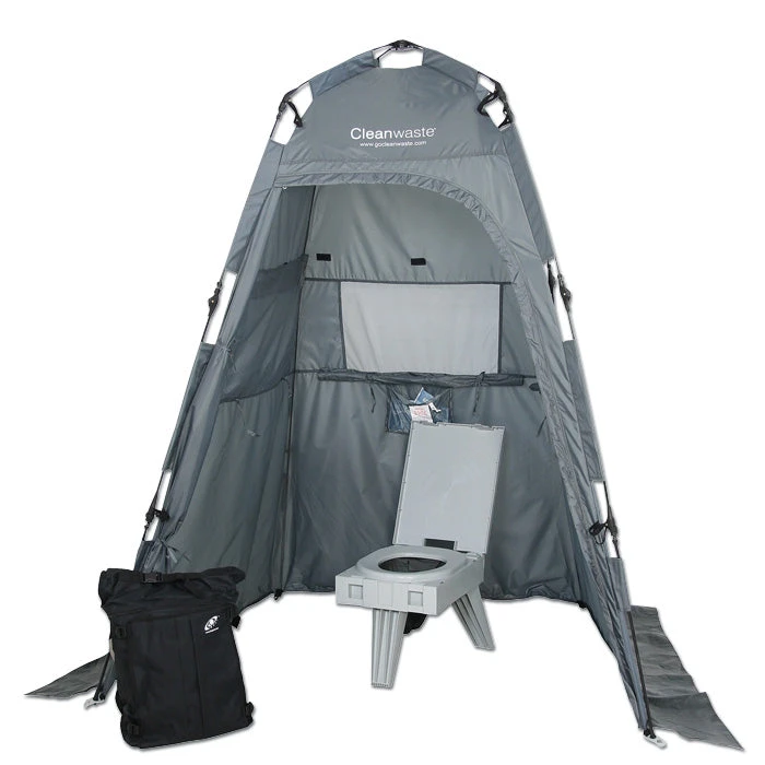 No matter where or when a restroom is out of reach, unsafe, or unsanitary, be prepared with the Cleanwaste Toilet System Kit with Shelter. It is a truly portable, easy to use, and sanitary means of human waste disposal that sets up in seconds. The perfect choice for a private, portable, option.