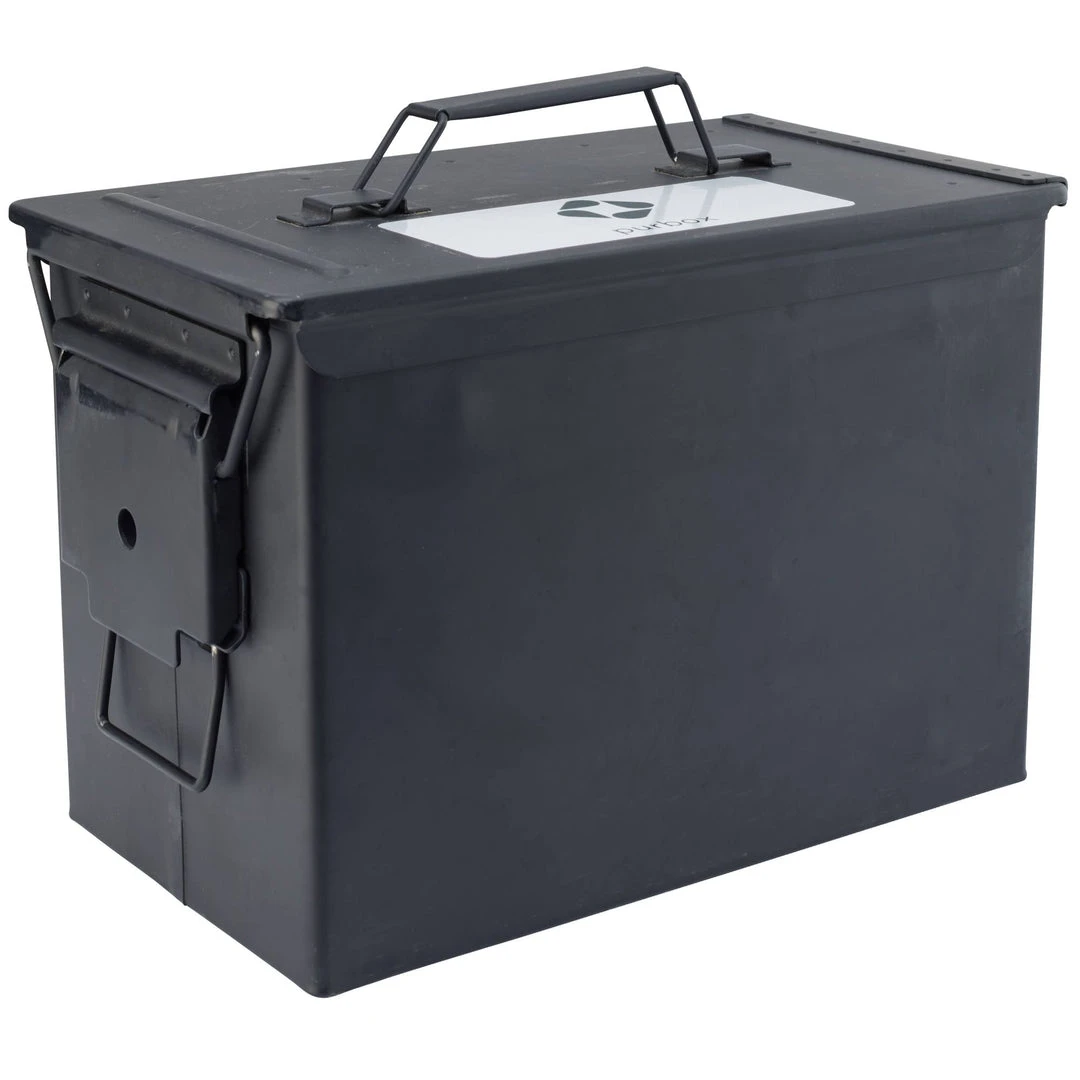 - Housed in a powder-coated Fat 50 ammo can with a hinged lid, rubber seal, and carrying handle