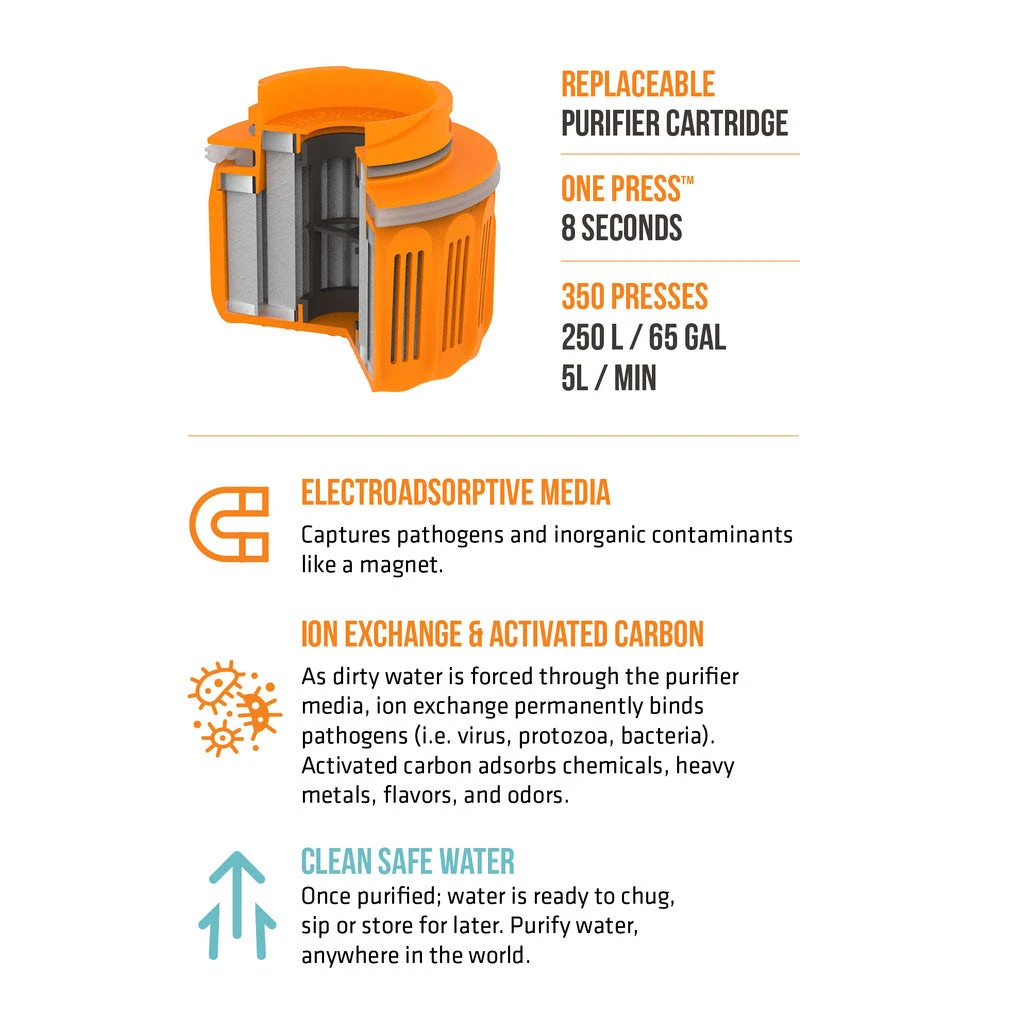No other purifier rivals the speed, simplicity, and effectiveness of the Grayl GeoPress. Tap into the world’s water sources and safely drink from sketchy spigots, hotel sinks, murky rivers, wells, or lakes to make safe, clean drinking water anywhere on earth.