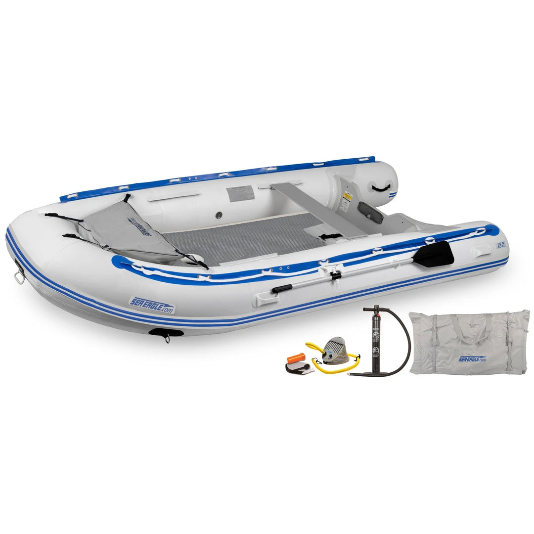 The Sea Eagle 12’6 Sport Runabout Drop Stitch Inflatable Raft Deluxe Package is best suited for those wishing to have more roomy space. Yet still portable enough to pack away relatively small and stow under deck, in an RV, or in the trunk of a small car.