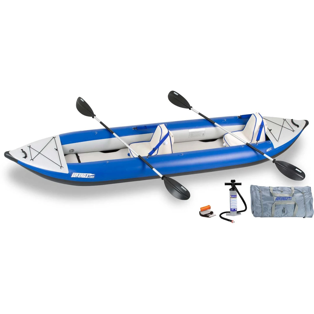 The Sea Eagle Explorer 420X Inflatable Kayak is the kayak for you if you plan on camping, overnight trips or just plain need the extra storage space. A great wet or dry boat, it is tough enough for class four whitewater, but stable, dry and comfortable on flatwater as well.