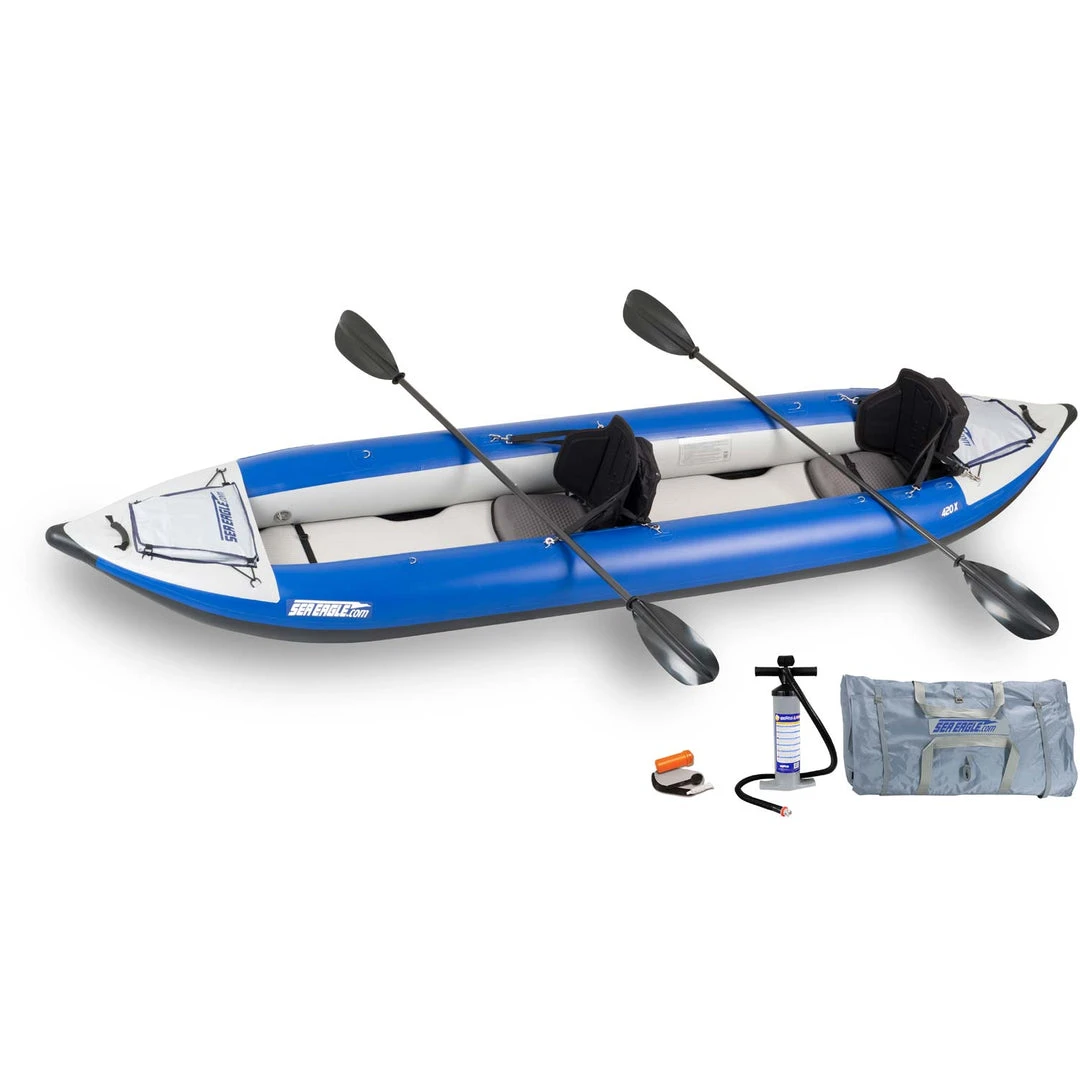 The Sea Eagle Explorer 420X Inflatable Kayak is the kayak for you if you plan on camping, overnight trips or just plain need the extra storage space. A great wet or dry boat, it is tough enough for class four whitewater, but stable, dry and comfortable on flatwater as well.