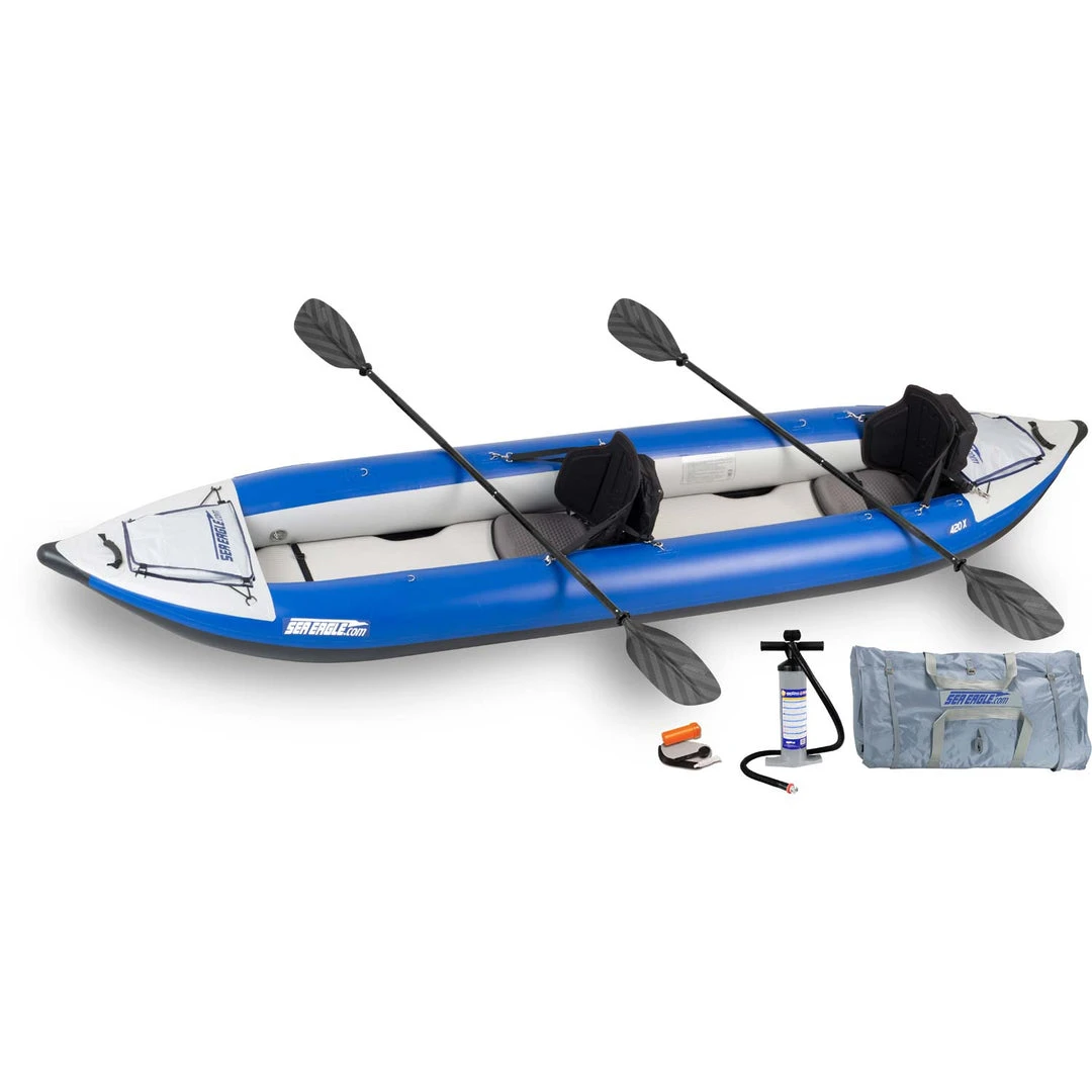 The Sea Eagle Explorer 420X Inflatable Kayak is the kayak for you if you plan on camping, overnight trips or just plain need the extra storage space. A great wet or dry boat, it is tough enough for class four whitewater, but stable, dry and comfortable on flatwater as well.