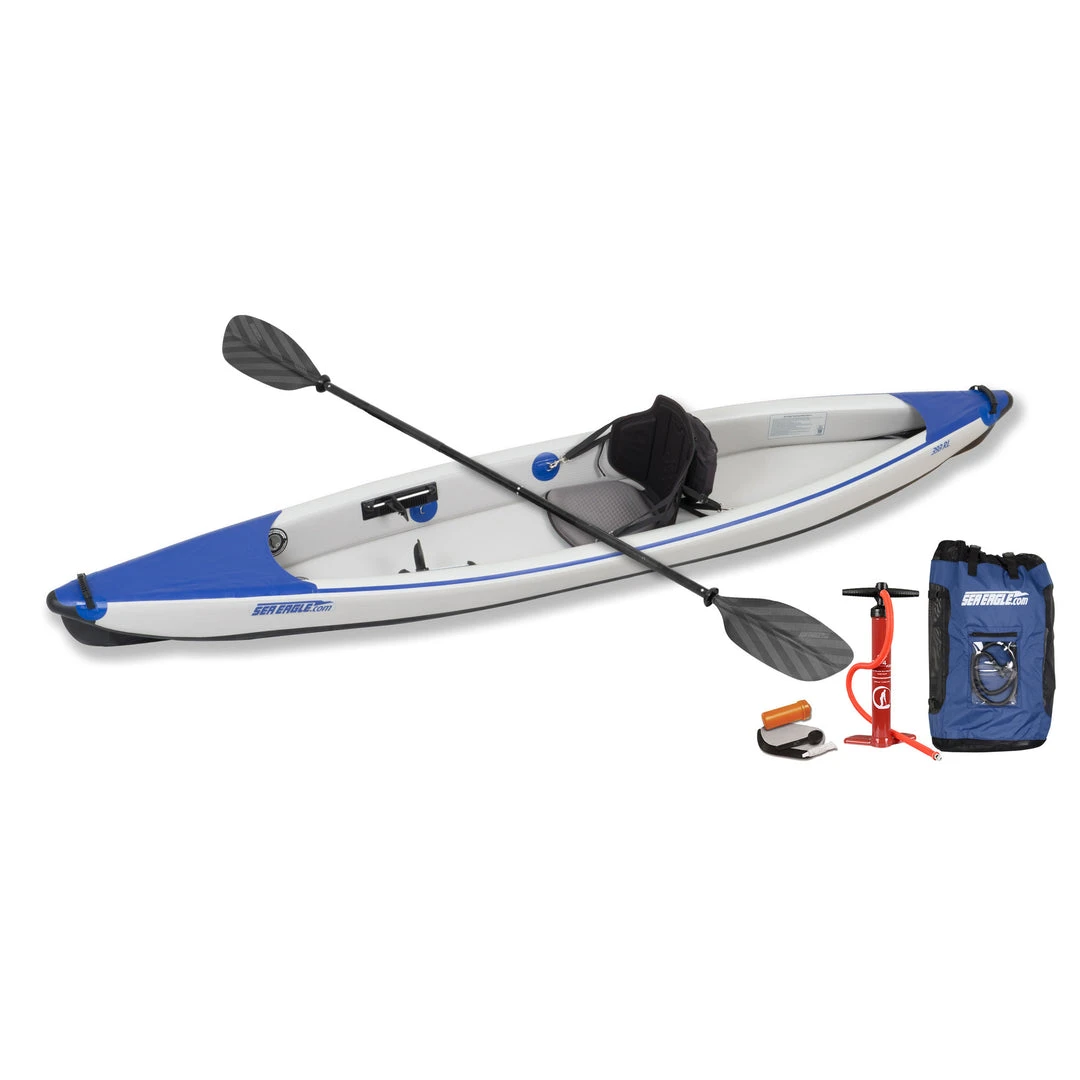 The Sea Eagle RazorLite 393 Inflatable Kayak is the world’s first all drop stitch inflatable kayak! Lighter, narrower, and faster to paddle, it’s a high-performance solo kayak for the adventurer. Its straight hull design maximizes waterline length for more speed and better performance.