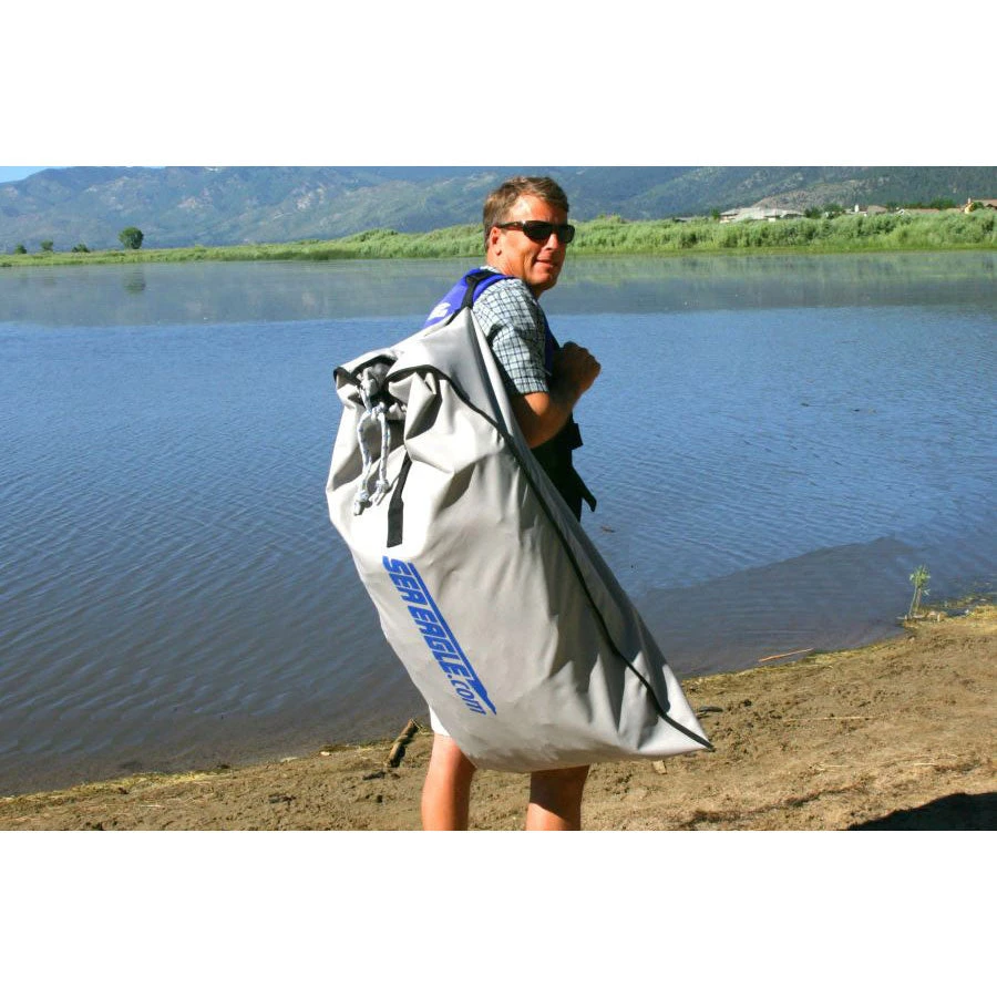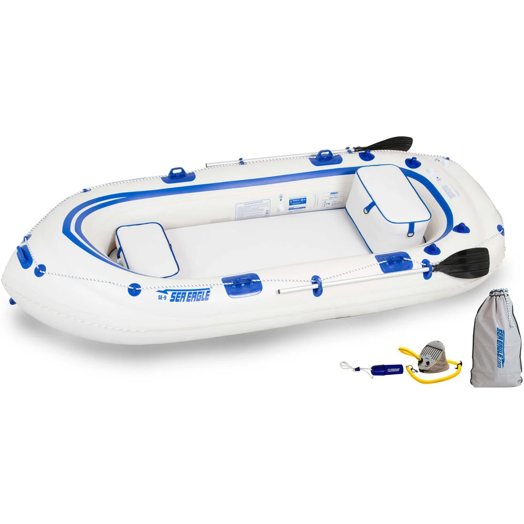 The Sea Eagle SE9 Inflatable Raft Start Up Package is a lightweight, affordable, inflatable fishing boat holds up to 4 people, is super stable and works great with small gas or electric motors. This package has everything you need for rowing, fishing or running moderate whitewater.