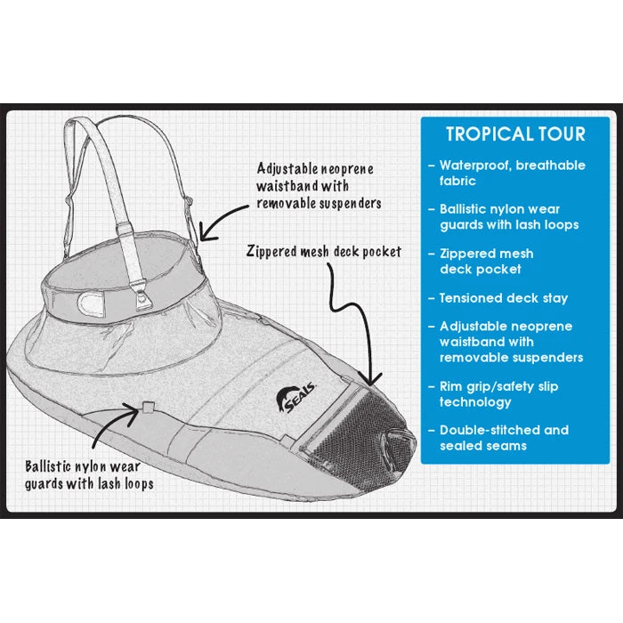 The waterproof and breathable Seals Sprayskirts Tropical Tour Kayak Spray Skirt gives you the ultimate in performance. The adjustable waist closure fits a wide variety of paddlers, while the tensioned deck stay keeps the skirt taut.
